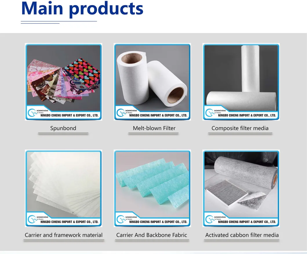 We supply the various types of nonwoven fabric used as the filter media in the field of air and liquid filtration. The main application includes personal care respirators, home care air cleaner, heavy duty vacuum cleaner and automobile cabin air filter products. Our product categories include PP melt-blown nonwovens, PP spun-bonded nonwovens, PET fibre hot-rolling nonwovens, PET filament spun-bonded nonwovens, PET filament thermos-bonded nonwovens, Needle punched nonwoven, Water punched nonwoven, Activated carbon filter media, Ultrasonic composite nonwovens, etc.
